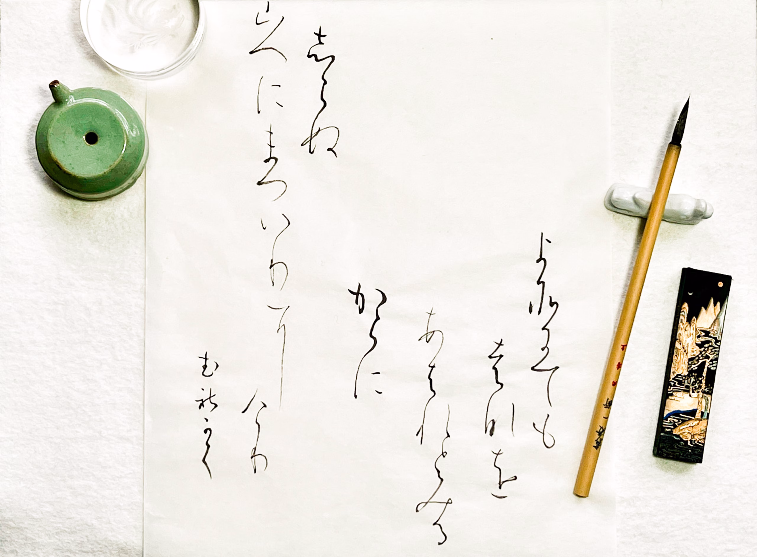 Enjoy the delicate feel of paper made for kana calligraphy and the meditative action of grinding your sumi ink, learning how calligraphers write with kana brushes, as well as gaining insight into the choices of characters used, and layout of the poem, in the process of writing the poetry.